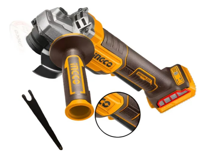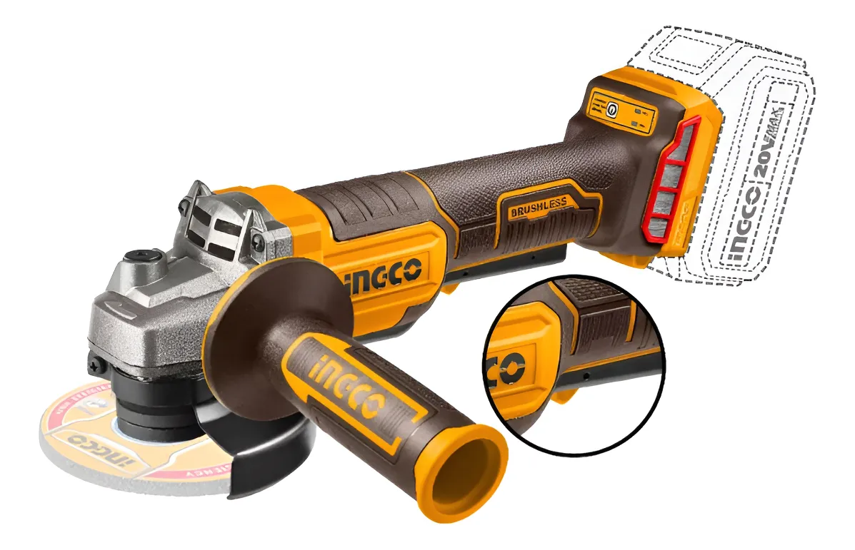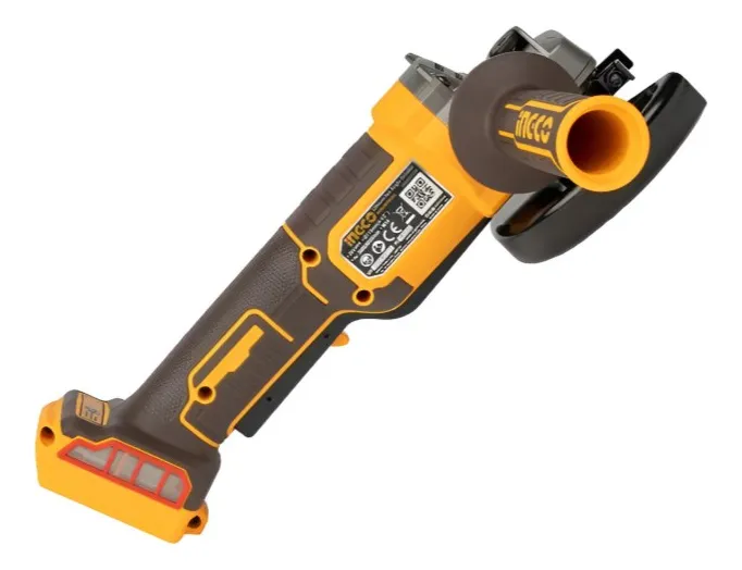 Marca: Ingco Modelo: CAGLI211156 Línea: Industrial BATERÍA Y CARGADOR NO INCLUIDAS. • 20V • Motor sin escobillas • 115 mm (4-1/2”) • Rosca: M14 • Velocidad: 3000 / 8000 / min • Interruptor de gatillo de seguridad (gatillo paleta) • Botón de bloqueo del disco