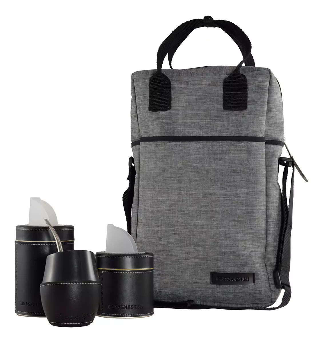 -Recipientes metálicos Yerba (720 cm3), Azúcar (486 cm3), revestidos de cuero sintético, con tapa vertedora.