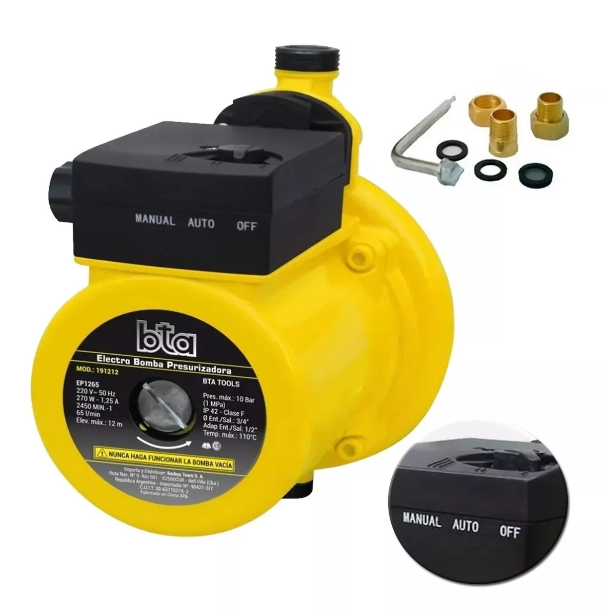 La bomba Bta Tools 191212 aumenta la presión del agua y esto permite que los líquidos suban hasta una altura máxima de 12m.