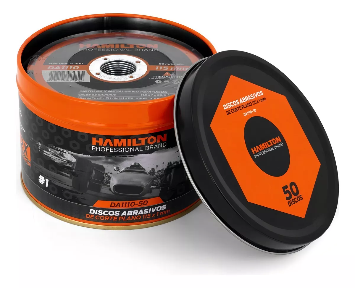 Discos de corte abrasivos en lata con 50 unidades. Diseñados para amoladoras de 115 mm y con un grosor de 1 mm. Elaborados con óxido de aluminio, son aptos para el corte de metales y metales no ferrosos.