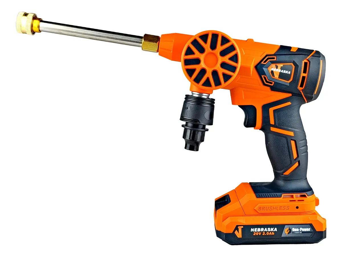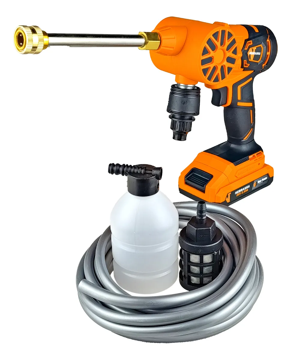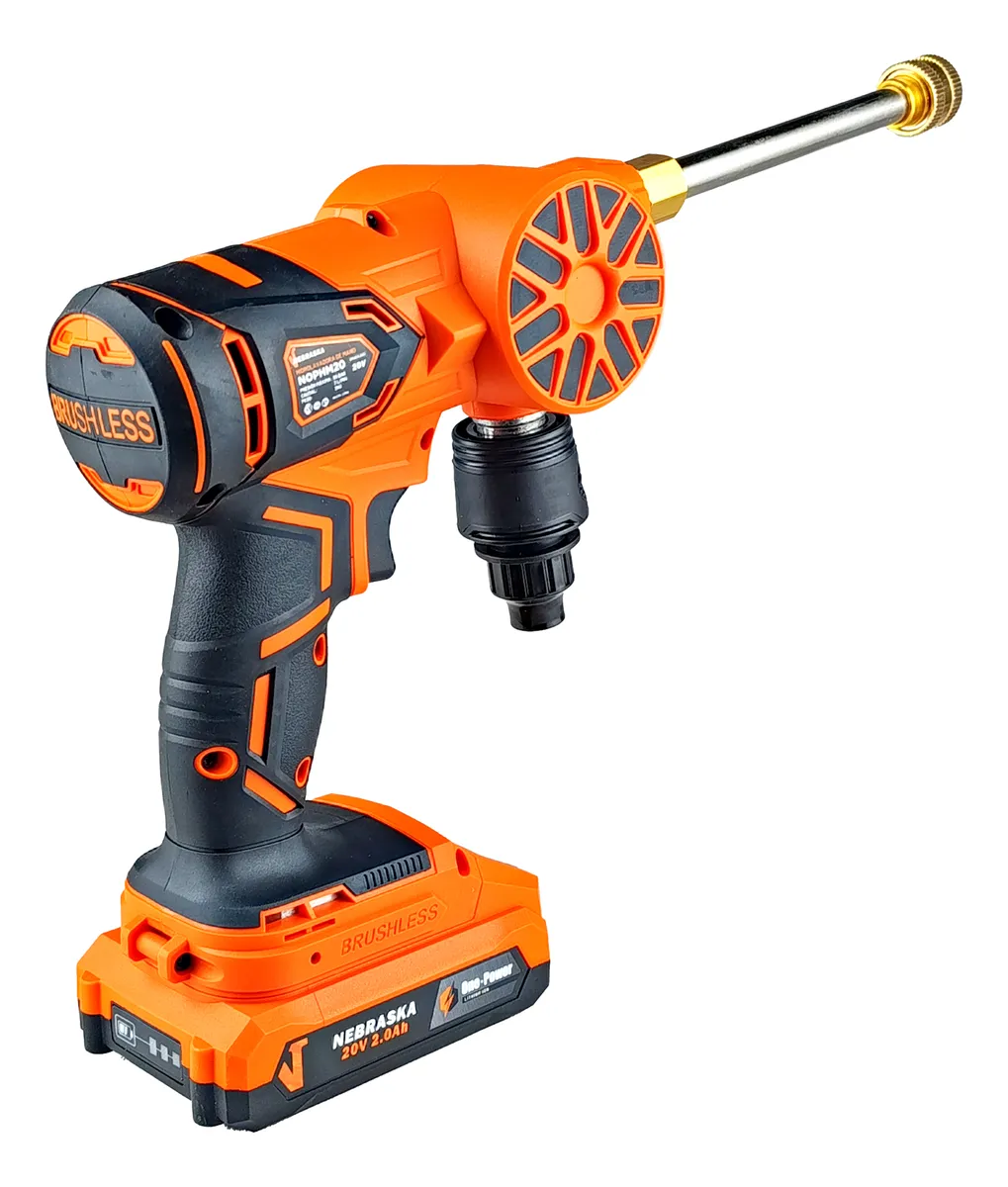 HIDROLAVADORA DE MANO NOPHM20 DATOS TECNICOS: Tensión: 20V Motor: Brushless (sin escobillas) Presión Maxima: 60 BAR Caudal: 3L/min Peso: 2 Kg Partes que Incluye: 2 Boquillas 0 y 45° 2 Anillos de Goma 1 Conector de Entrada 1 Poste de Hierro 1 Rociador Espuma 1 Filtro 1 Manguera de 8mm por 5mts 1 Bateria 2 Ah 1 Cargador 1 Manual