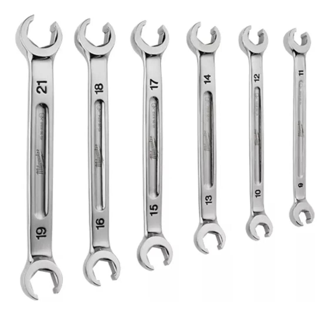 Juego De Llaves Combinadas Doble Boca Milwaukee 6pz 9 A 19mm SET DE 6 LLAVES PARA TUERCAS ABOCARDADAS DE DOBLE EXTREMO (MÉTRICAS) 4822-9471 Juego de 6 piezas de llaves para tuercas acampanadas de doble punta – Métrico Nuestro juego de 6 piezas de llaves para tuercas acampanadas de doble punta ofrece una identificación fácil con etiquetas de tamaño rellenas con tinta para una distinción rápida entre las llaves SAE y métricas. Nuestros extremos abiertos de perfil delgado permiten un acceso más fácil a tuercas en línea y cabezas de pernos hexagonales difíciles de alcanzar. El cómodo diseño de mango de perfil en doble T permite una comodidad superior para el usuario, incluso cuando aplica mucho torque. CONTENIDO. 9-11/10-12/13-14/15-17/16-18/19-21