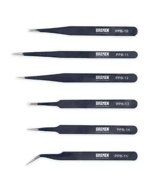 | Pinzas de precisión antiestáticas tipo Bruselas. | Fabricadas en acero inoxidable de gran resistencia a la deformación y recubiertas con material aislante que las torna antiestáticas. | Cada pinza incluye un protector de puntas, que las protege de golpes o deformaciones, prolongando la vida útil del producto. | Incluye funda para traslado.