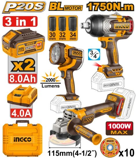 Kit combinado inalámbrico de 20 V (amoladora angular + llave de impacto de 3/4″ de 1750 Nm) con 2 baterías de 8 Ah, cargador y caja – INGCO COSLI250593.