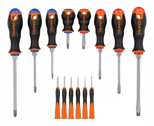 Este set de desarmadores de la marca Truper, modelo DTJ-14B, incluye 14 piezas y viene en un blister 14197. Los desarmadores tienen un mango Comfort Grip para un manejo cómodo y seguro. Las puntas están magnetizadas para facilitar el trabajo con tornillos y están hechas de acero al cromo vanadio para mayor durabilidad. Además, cuentan con un hexágono en la barra que maximiza el torque cuando se utiliza con una llave.