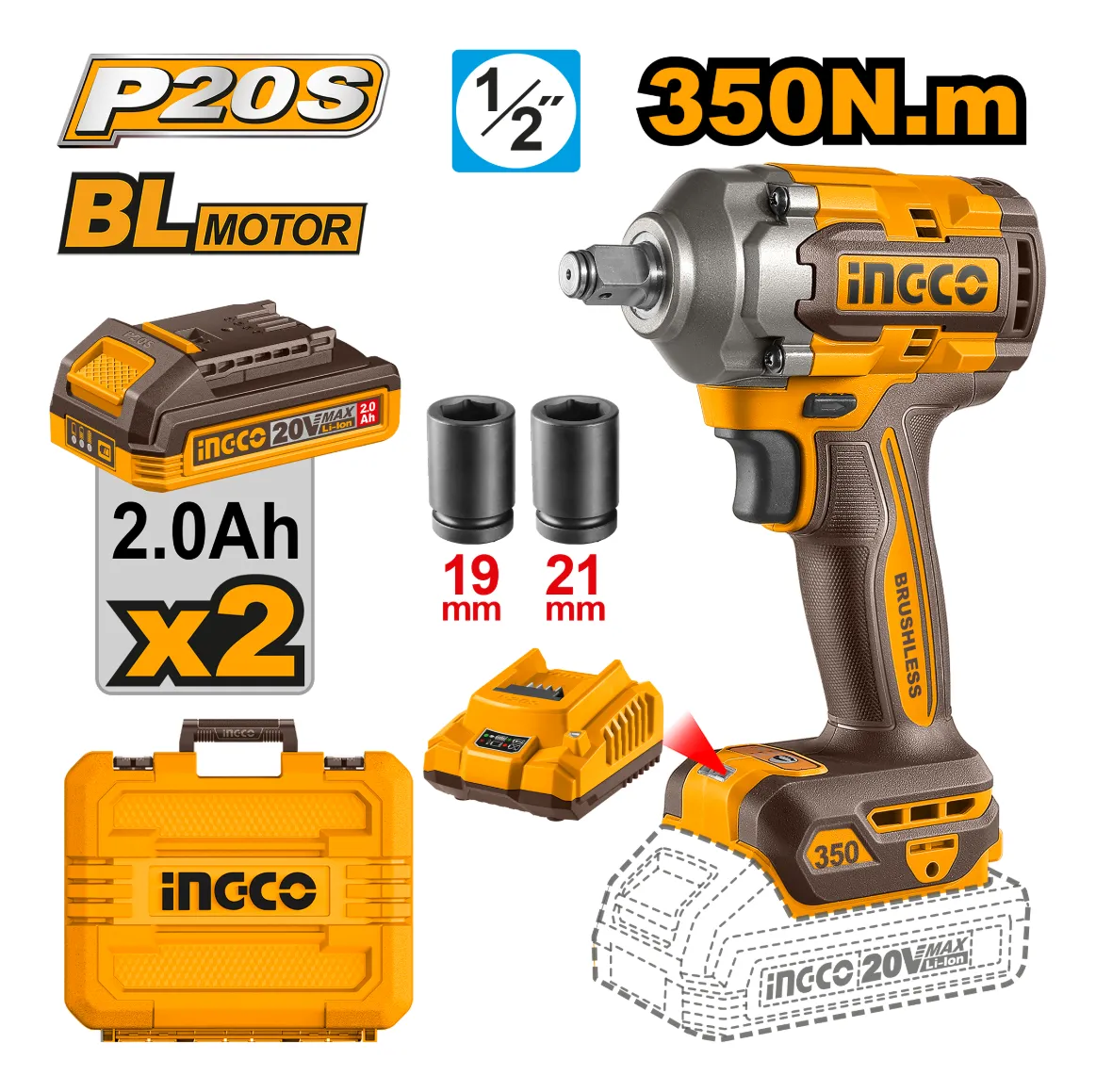 LLAVE DE IMPACTO A BATERIA 350NM 20V P20S 1/2″ BRUSHLESS MOTOR CON 2 BAT + CARGADOR + SET DADOS + VALIJA