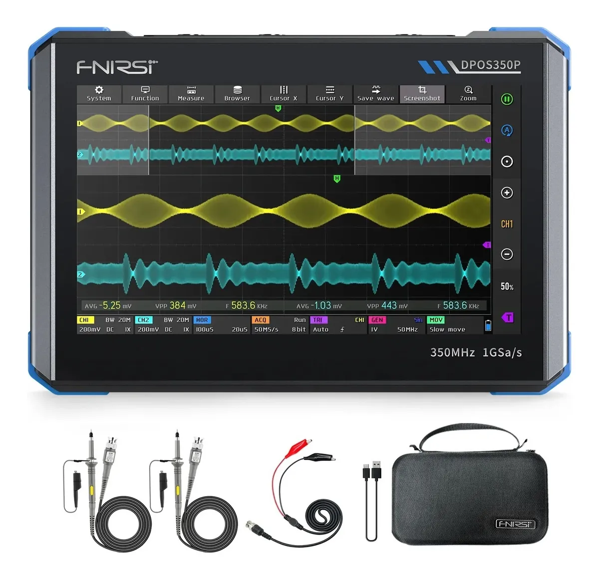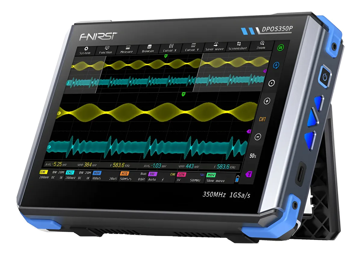El osciloscopio FNIRSI DPOS350P combina 4 equipos en 1 con un osciloscopio, analizador de espectro, analizador de respuesta en frecuencia y generador de señales en un solo dispositivo portátil, ideal para I+D, reparación y educación.