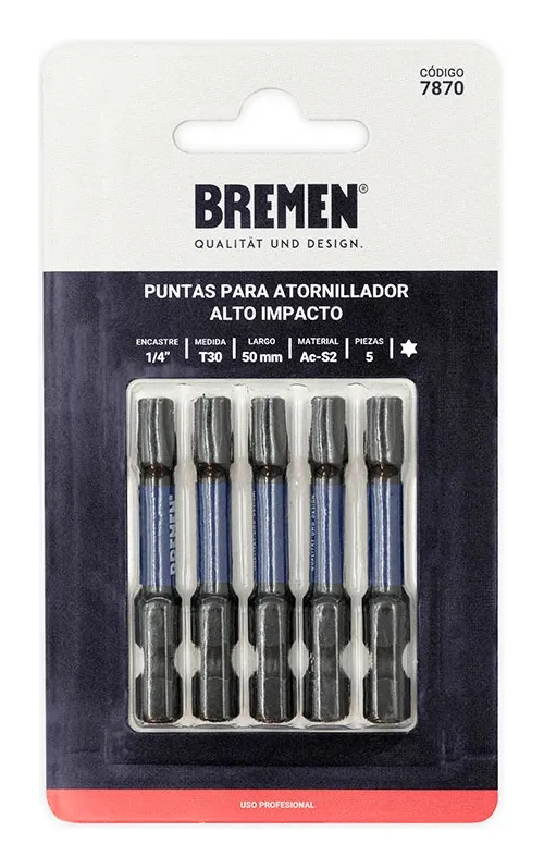 Estas puntas de atornillador están equipadas con un imán potente que asegura un agarre firme y seguro, evitando que los tornillos se caigan durante el trabajo. Son increíblemente fáciles de usar y son perfectas para cualquier atornillador, taladro o destornillador. En resumen, la Punta Atornillador Impacto Bremen Torx T30 X 50mm X 5u 7870 DGM es una herramienta confiable, duradera y eficiente que no puede faltar en tu caja de herramientas.