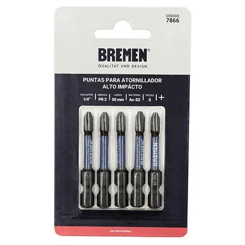 Este producto es un juego de 5 puntas Pr2 x 50mm de la reconocida marca Bremen, modelo 7866. Cada una de las puntas tiene una longitud de 2 pulgadas, es decir, 50,8mm, lo que las hace ideales para una variedad de trabajos de bricolaje y profesionales. Lo que distingue a estas puntas es su dureza 50X, lo que significa que son 50 veces más duras que una punta tradicional. Esta característica las hace extremadamente duraderas y resistentes, superando con creces la vida útil de las puntas convencionales. Además, su condición es completamente nueva, garantizando su calidad y rendimiento óptimo. El encastre hexagonal de 1/4″ permite un ajuste seguro y firme en su herramienta de elección. Este juego de puntas Bremen 7866 es una inversión inteligente para cualquier caja de herramientas, proporcionando resistencia y durabilidad en todas sus tareas de atornillado.