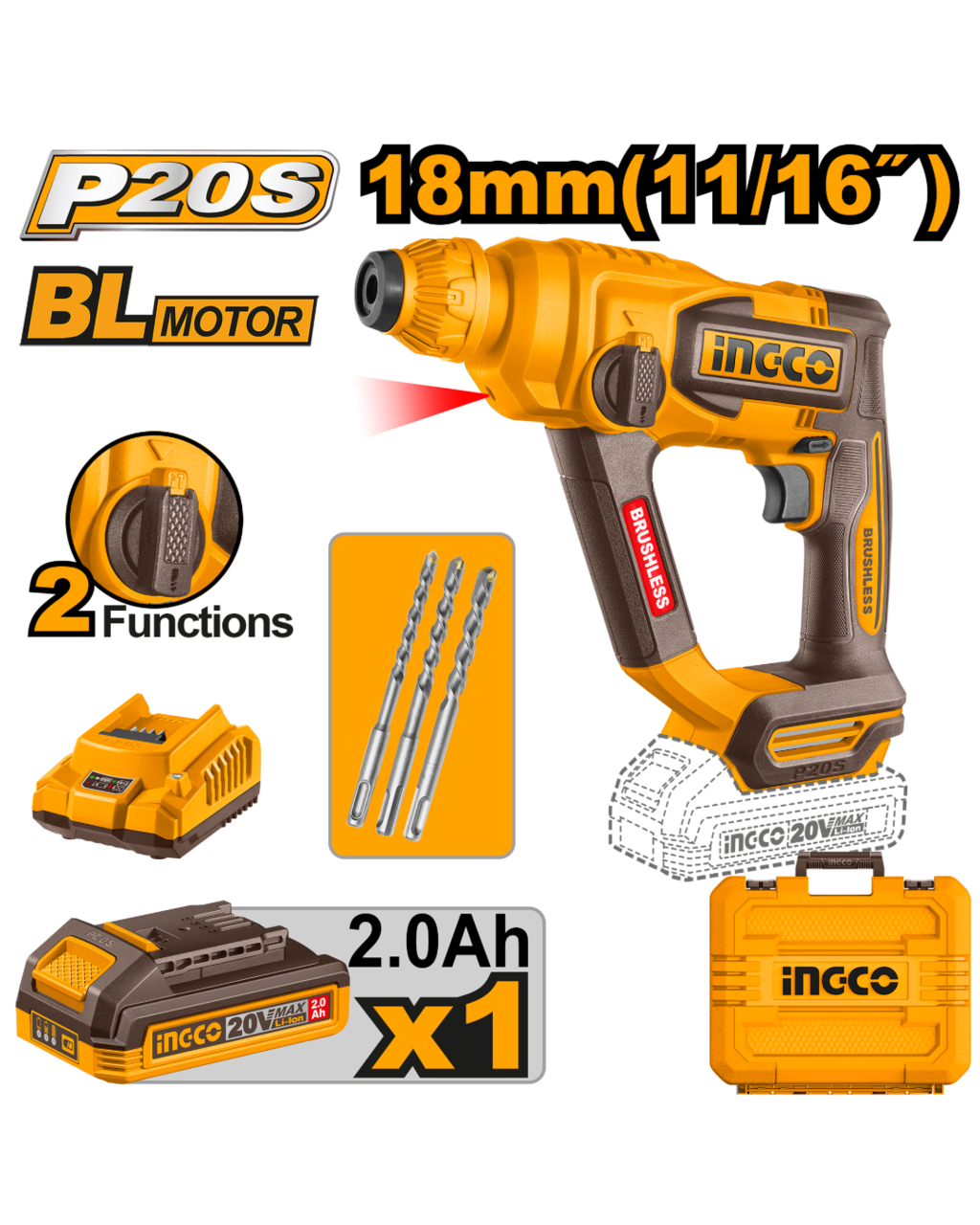 ROTOMARTILLO A BATERÍA 20V P20S SDS PLUS 1.8J + 3 MECHAS, C/BATERÍA, CARGADOR Y VALIJA