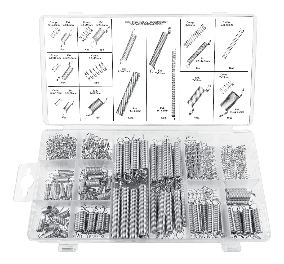Set de resortes surtidos • Marca: Ruhlmann • Modelo: RU43234 • Juego de resortes de tensión: Hay 20 tipos diferentes de resortes disponibles en diversas especificaciones y tamaños, incluyendo 124 resortes de tensión y 76 resortes de compresión, un total de 200, que pueden satisfacer una amplia gama de necesidades. Material de alta calidad. El resorte de tensión está fabricado en acero galvanizado de alta calidad, resistente y duradero. Estos resortes son lisos, planos, resistentes a la corrosión y altamente extensibles para garantizar el máximo rendimiento. Tamaño del resorte de tensión: 5,15 x 20,6 mm, 6,35 x 22,2 mm, 5,55 x 25,4 mm, 7,95 x 28,5 mm, 7,94 x 31,7 mm, 8,75 x 36,5 mm, 0,281 1,5 x 1,00 mm, 8,75 x 46,8 mm, 7,15 x 50,8 mm, 7,14 50,8 mm, 7,94 x 44,4 mm, 4,75 x 44,4 mm, 3,95 x 79 mm. Tamaño del resorte de compresión: 6,35×10,3 mm, 7,15×12,7 mm, 5,55×17,4 mm, 7,15×19,05 mm, 9,55×15,8 mm, 9,54×19,05 mm, 9,15×3,94 mm 4, 0,55,5 x 38,1 mm. Amplia gama de usos: Estos resortes de compresión se utilizan en diversas aplicaciones, como instalaciones, automóviles, tiendas, aeronaves, maquinaria, electrodomésticos, muebles y otros ámbitos. Se emplean para unir y asegurar elementos entre paneles, proporcionando una solución fiable para una gran variedad de necesidades.