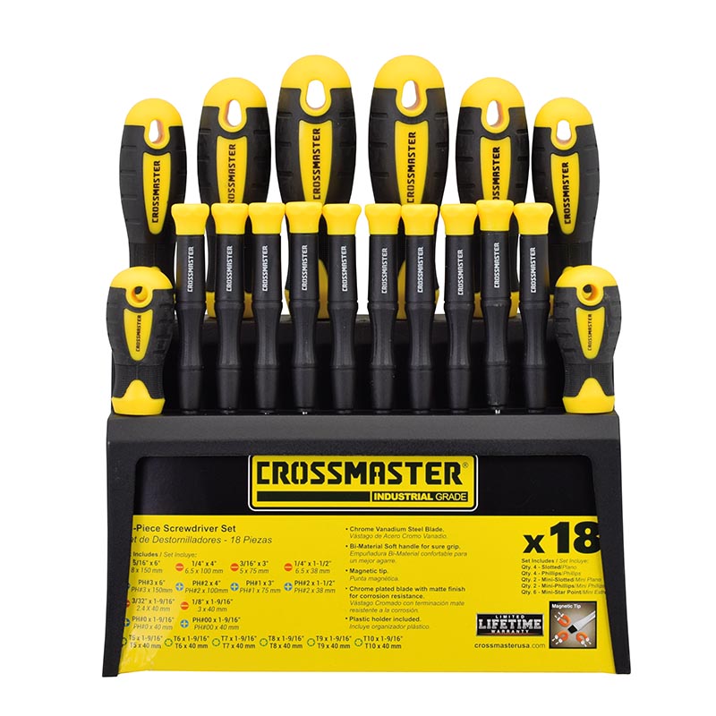 Phillips: #00 x 40 mm / #0 x 40 mm #1 x 75 mm / #2 x 38mm / #2 x 100 mm #3 x 150 mm Plano: 2.4 x 40 mm / 3 x 40 mm / 5 x 75mm / 6.5 x 38 mm / 6.5 x 100 mm / 8 x 150 mm Torx: T5 x 40 mm / T6 x 40mm